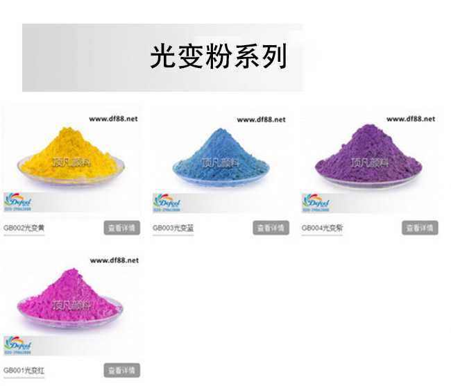 點擊:廣州頂凡變色顏料專業生產各類特殊變色顏料,光變粉、溫變粉、夜光粉、珠光粉都是我們公司的主打產品。作為廣東省內僅有的幾家光變粉生產廠家之一,我們頂凡一直都是以優惠的價格和高品質著稱,頂凡的感光變色顏料受到全國各地客戶的一致好評。